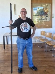 Nico Stalenburg, sinds 2025 balievrijwilliger heeft echt een passie voor geschiedenis, die hij bij ons echt kwijt kan. Op de foto zie je hem het een van onze tweehandszwaarden - de sensationele vondst in december 2025.