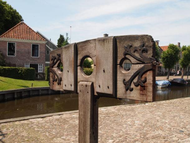 In de schandpaal – die in Sloten nog altijd een prominente plek heeft – werd je met hoofd en armen vastgezet. Het is al erg genoeg om een dag lang zo te moeten staan, maar omstanders mochten je ook bespotten en bekogelen met van alles. Soms ging het ‘slechts’ om rot fruit, maar het kwam ook voor dat er stenen gegooid werden. En aangezien de veroordeelde vastzat en zich niet kon verweren, kon hij de stenen niet ontwijken. Niet zelden verliet een veroordeelde de schandpaal dan ook met verwondingen aan hoofd of armen. Wie op een drukke dag aan de schandpaal moest staan, kreeg het doorgaans dus zwaar te verduren. Rechters hielden daar ook rekening mee: voor een lichter vergrijp werd je op een rustige dag aan de schandpaal genageld, voor een zwaarder vergrijp op een drukke marktdag.
