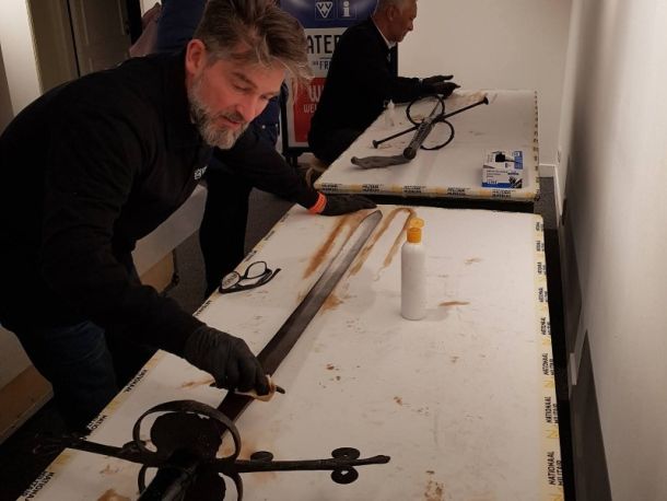 En toen kwam het telefoontje van het Nationaal Militair Museum. Of ze de twee zwaarden die op de Raadzaal hingen mochten onderzoeken. Birgit Yzer – die het collectiebeheer verzorgt – zei dat ze van harte welkom waren, en en passant zie ze ook dat we er nog tien hadden. En de conservervatoren van NMM ontploften bijna van enthousiasme: “Dan ben je als conservator echt heel blij”, zegt Casper van Dijk.