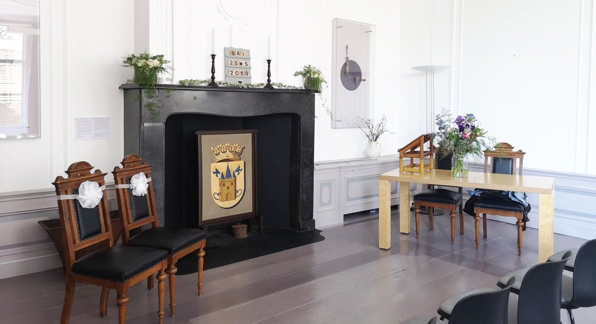 De prachtig gerestaureerde raadzaal op de eerste verdieping geeft uitzicht op de stadsgracht en de historische gebouwen aan weerszijden van het water.